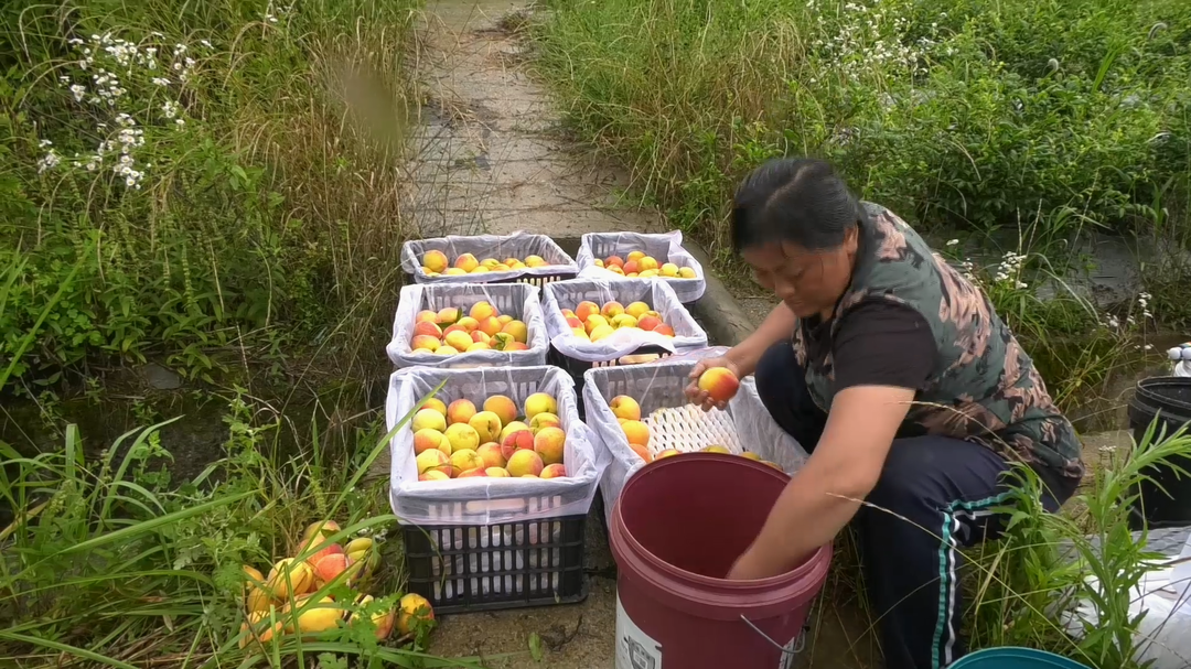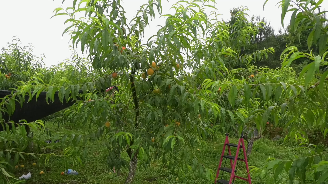 新湖南客户端6月19日讯(记者 杨秀知 苏世佳)6月18日,正值黄桃成熟时候,走进湘西土家族苗族自治州古丈县断龙山镇尚家村黄桃种植基地,连片的桃树枝繁叶茂,一个个圆润饱满的黄桃缀满枝头,空气中到处散发着诱人的甘甜桃香,果农们冒着细雨穿梭在桃树间,熟练地采摘、分拣、装筐,现场一派丰收的景象。