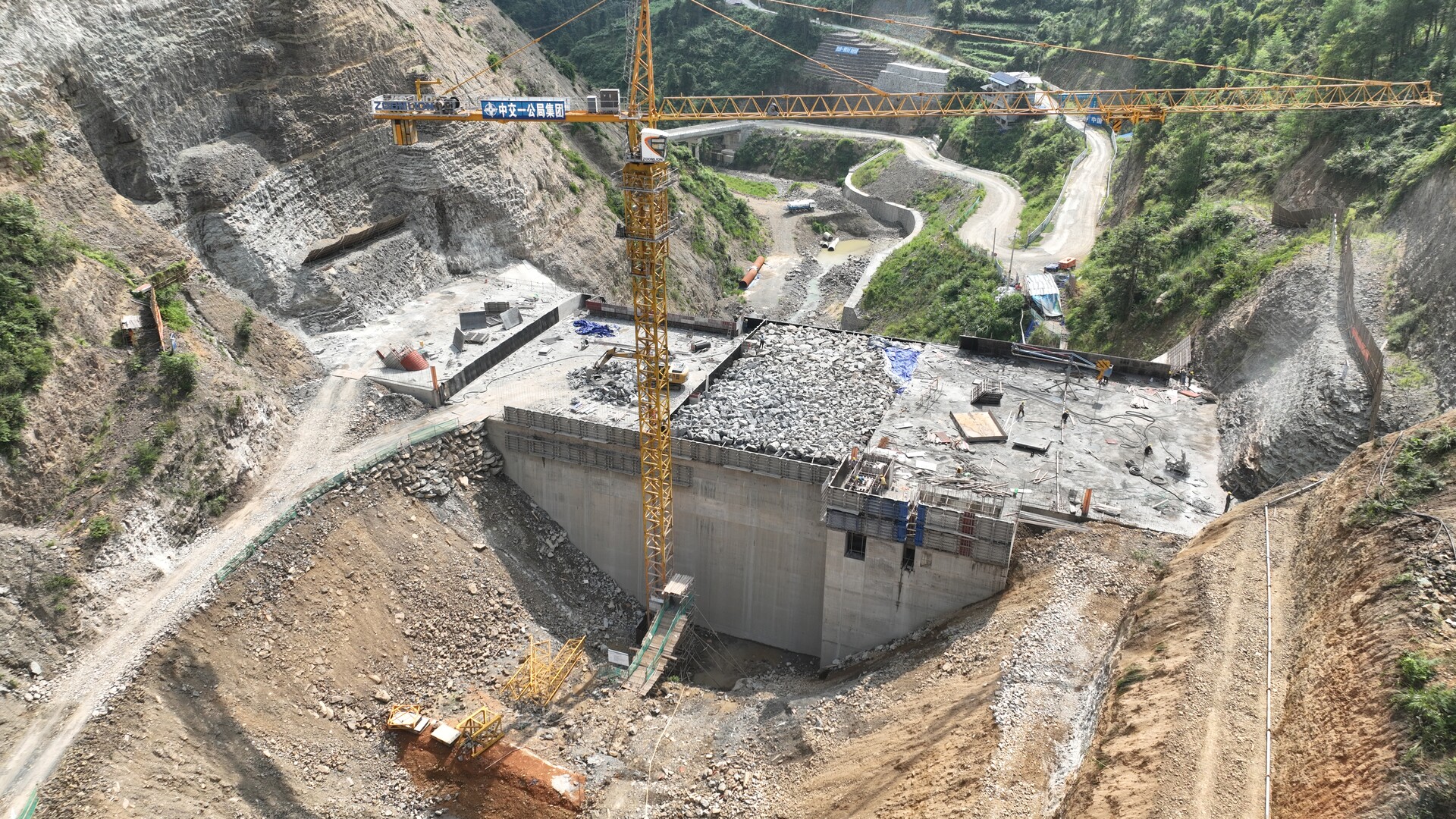 该水库位于牛角山村与翁草村交界处,大坝主体堆石混凝土已浇筑至397.5米高程,累计完成混凝土浇筑47000立方米。进村公路已具备通车条件,桥梁工程也已完成竣工验收。