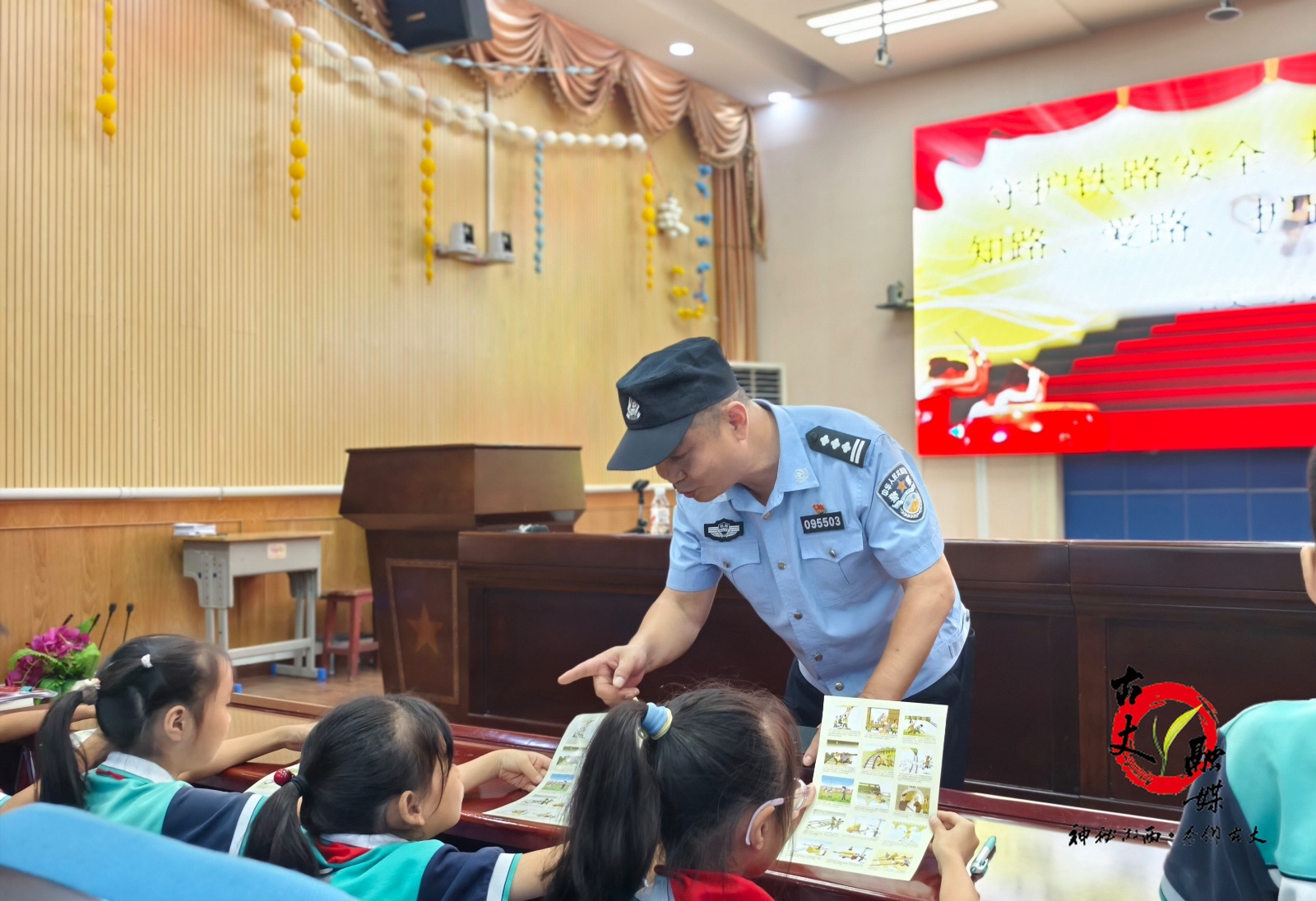 为让安全教育“活”起来,民警们还开展沉浸式互动宣讲。他们手持彩色铁路安全宣传册,走到会场座位间,指着图文案例逐页讲解:“大家看这个标志,代表铁路保护区,看到它就意味着要远离至少20米。”面对“发现有人在铁路边玩耍该怎么做”的提问,四(4)班张同学立刻举手:“要先喊他离开,再告诉老师或警察!”互动问答间,“知路、爱路、护路”的理念逐步深入学生心中。