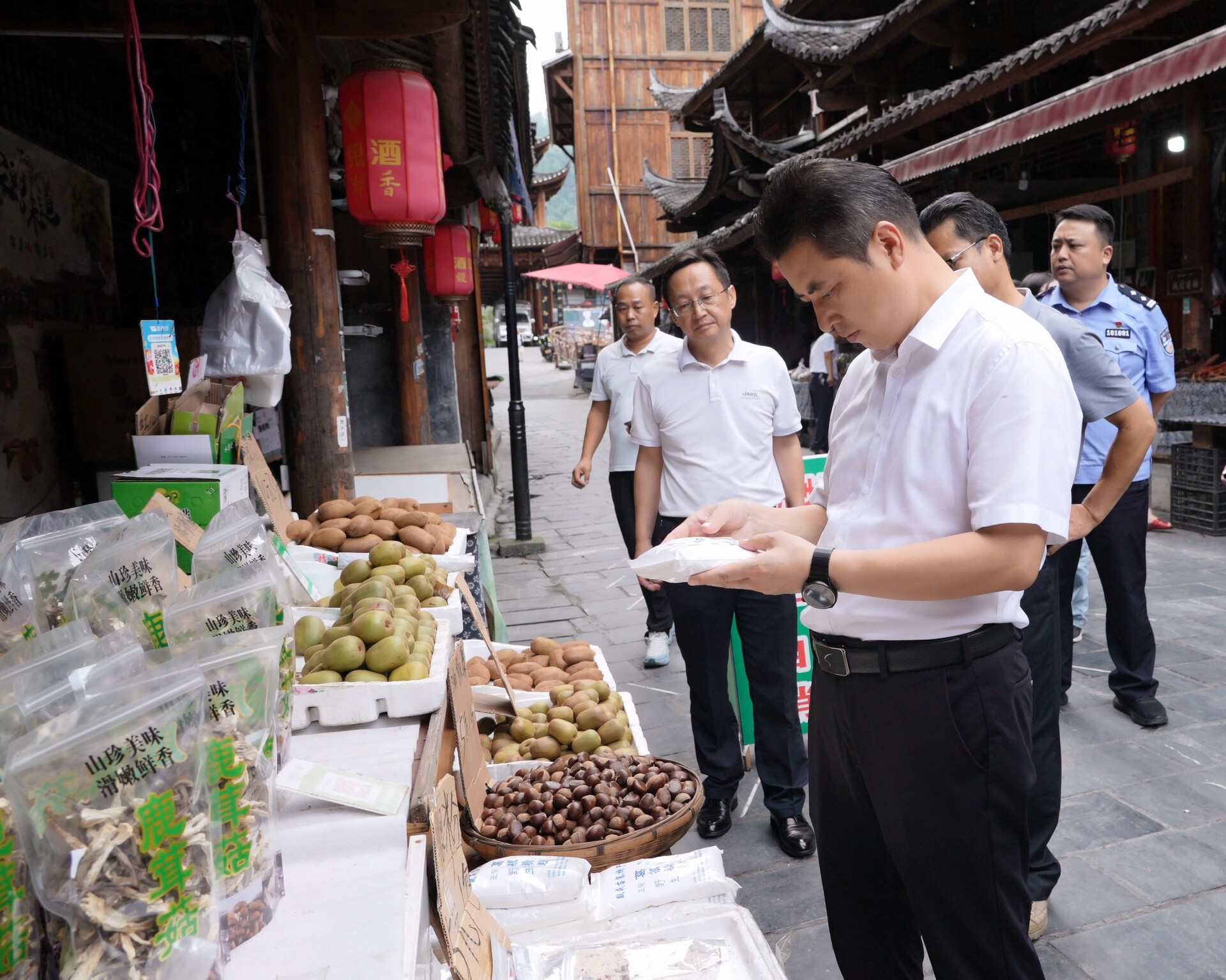 滕朝辉先后来到夯吾戎寨、墨戎苗寨等景点,实地检查景区环境卫生、旅游市场监管、景区安全管理等工作,随机抽查商铺商品质量,并就发现问题现场交办。他叮嘱景区负责人,要坚持诚信经营,压实商户主体责任,严把商品质量与包装标准,切实维护旅游市场秩序和消费者权益。在默戎镇旅游基础设施提标改造项目现场,滕朝辉详细了解工程进展,要求加快工作进度,确保项目按时保质推进。