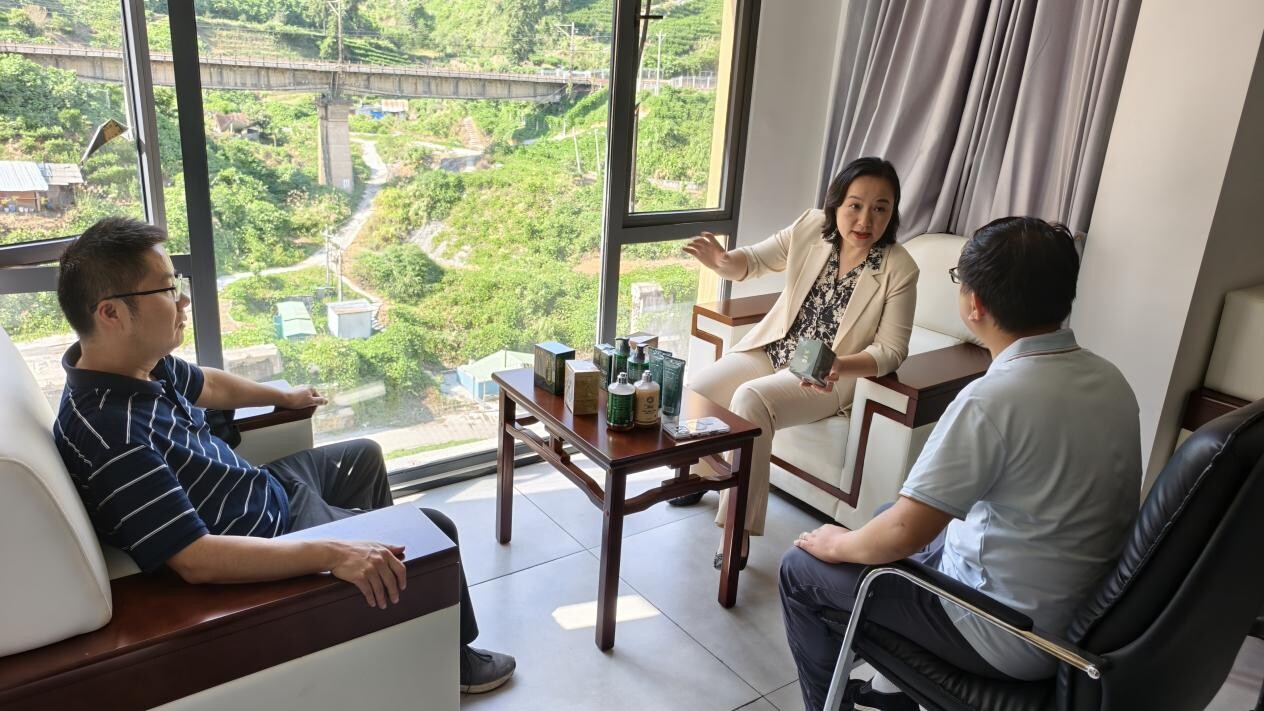 在湘西苗菩送福电子商务有限公司,90后负责人潘勇的汇报令调研组眼前一亮:公司成立仅2年,专注苗族中草药洗发水研发,通过抖音黑标旗舰店、快手、视频号等多平台运营,2024年线上销售额达5000余万元,2025年截至10月已完成7300万线上销售额,2025年目标突破1亿元,已带动40名返乡青年就业,其中00后占比60%。“年轻人创业不容易,你们干劲足、思路清,难能可贵!“滕树静仔细查看“苗仆”“苗天草”等品牌产品,对“中草药成分+古法工艺”的定位表示肯定。“苗药文化是独特优势,要通过短视频讲好‘苗家秘方’故事,开发便携装、礼盒装,吸引海外华人圈消费;同时,发挥‘传帮带’作用,带动更多年轻人加入电商创业,让‘古丈制造’走向世界。”