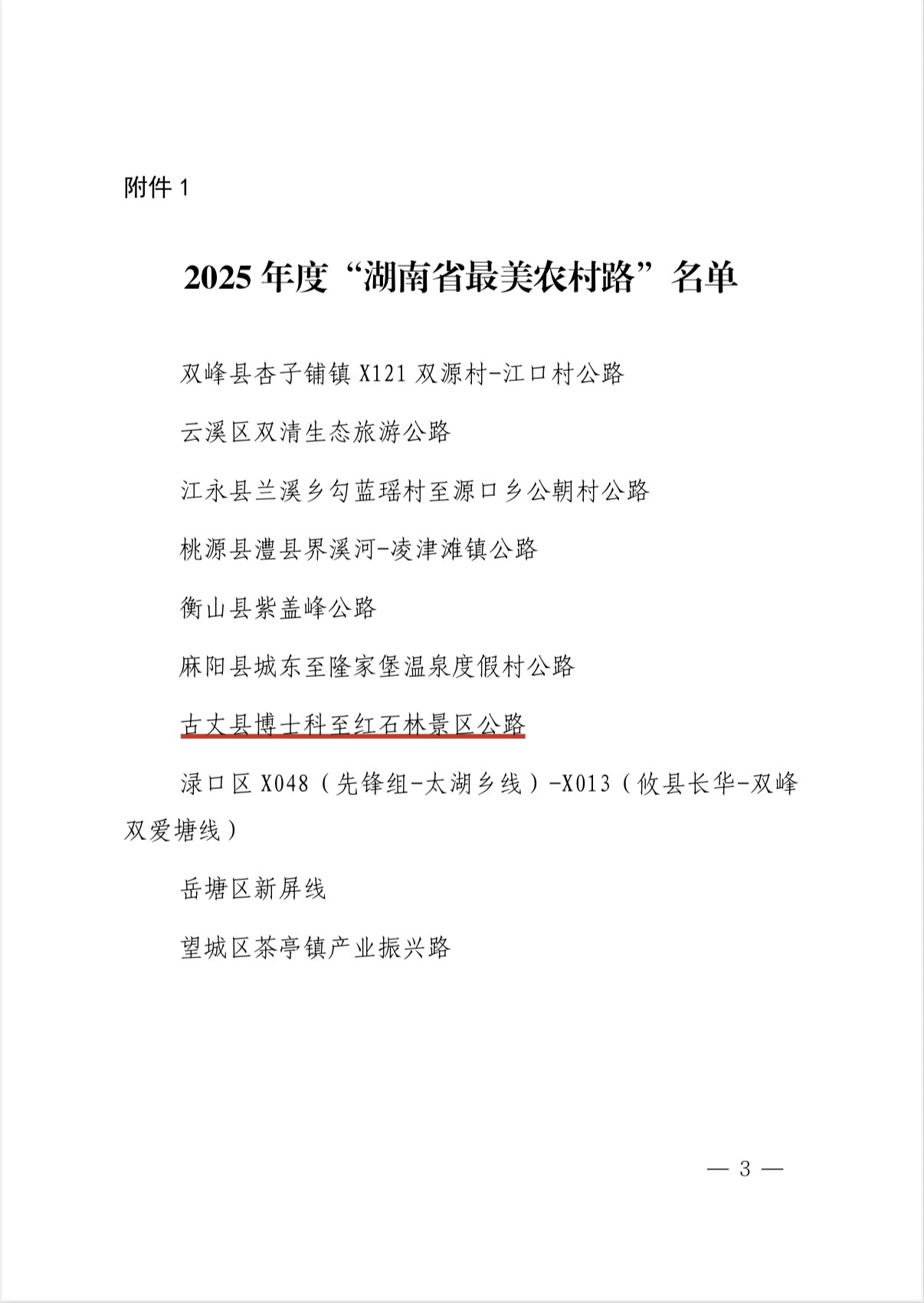 新湖南客户端12月4日讯(通讯员 王瑞媛)12月3日,湖南省交通运输厅公布2025年“湖南省最美农村路”名单,古丈县博士科至红石林景区公路(X037线)成功入选,成为全省10条获此殊荣的农村公路之一。