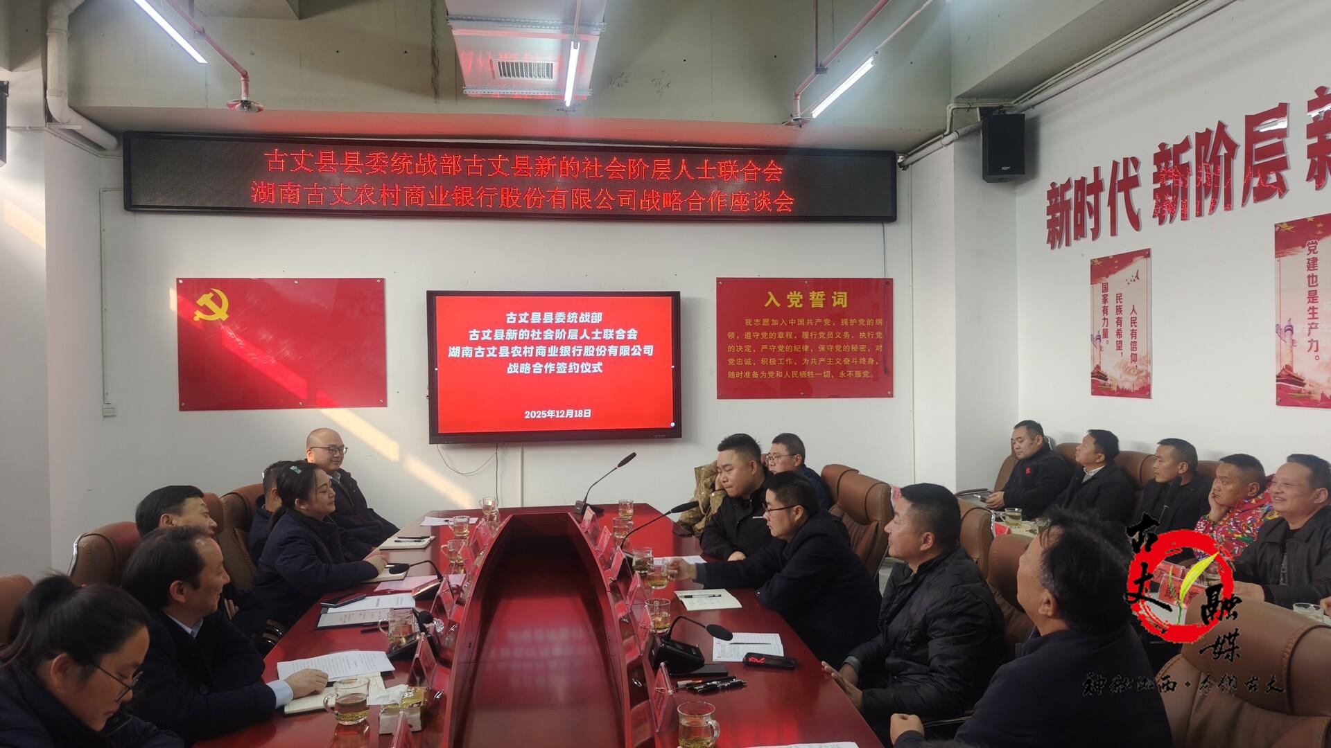 古丈融媒12月19日讯(记者 杨昊天 通讯员 罗浩)12月18日下午,古丈县新的社会阶层人士联合会与湖南古丈农村商业银行战略合作座谈暨签约仪式圆满举行。县政协副主席、工商联主席詹光寅,新阶联企业家代表、农商银行高管团队等30余人齐聚一堂,共绘“银企携手促发展”蓝图。