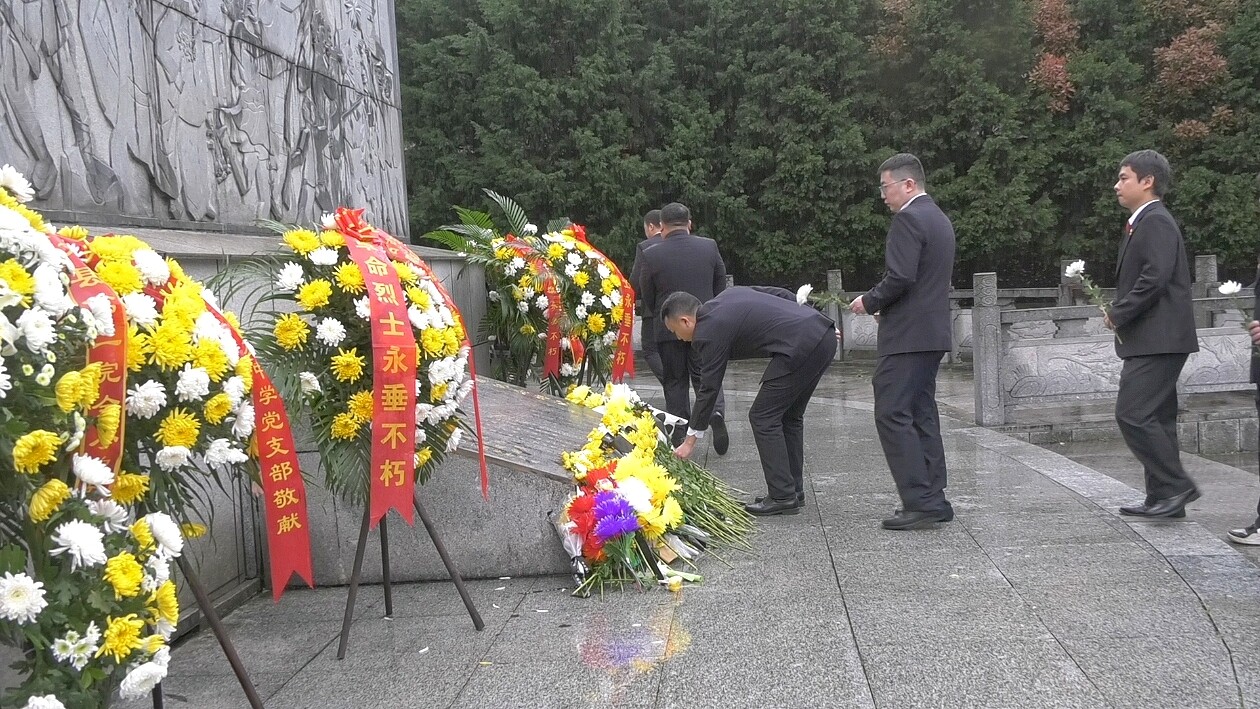 默哀结束后,全体人员依次向烈士纪念碑敬献鲜花,并逆时针瞻仰烈士纪念碑。一朵朵素洁的菊花,寄托着人们对先烈的无限哀思和崇高敬意。