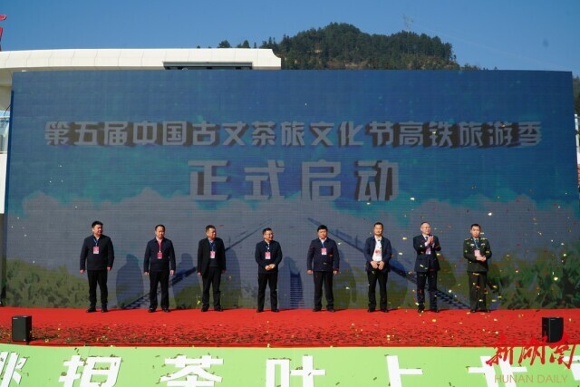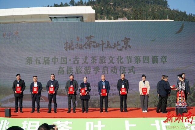 活动最后,邓晓东宣布第五届中国古丈茶旅文化节高铁旅游季正式启动,欢庆的苗鼓描绘出古丈人民内心对高铁到来的无比激动,对美好未来的无限向往。活动在歌舞《挑担茶叶上北京》的经典旋律中落下帷幕,古丈人民用一场温情而庄重、简约而热烈的仪式,向世人展示出高铁时代的古丈茶旅新面貌。