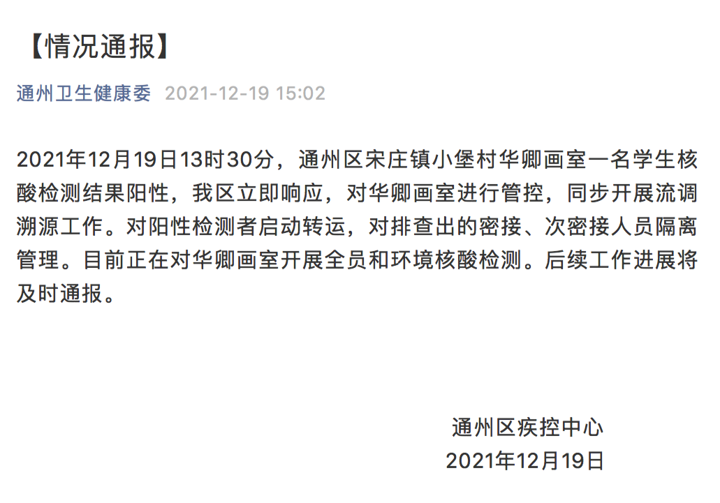 据北京市通州区疾控中心通报,2021年12月19日13时30分,通州区宋庄镇小堡村华卿画室一名学生核酸检测结果阳性,我区立即响应,对华卿画室进行管控,同步开展流调溯源工作。对阳性检测者启动转运,对排查出的密接、次密接人员隔离管理。目前正在对华卿画室开展全员和环境核酸检测。后续工作进展将及时通报。