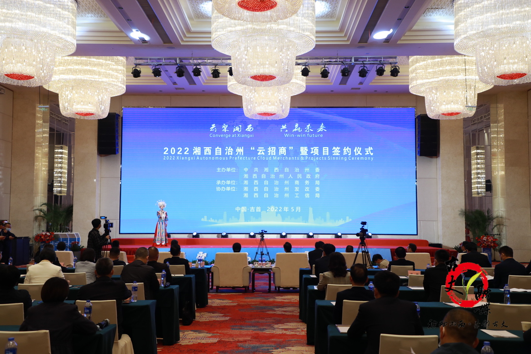 古丈融媒5月12日讯(通讯员 田群)5月11日下午,湘西州“云招商”暨项目签约仪式在吉首市凯莱大饭店一楼会议厅举行,各县市、湘西高新区和 4 个州政府驻外招商机构设分会场,2500多名客商应邀在各地通过视频会议形式参加此次活动。州委书记虢正贵出席并主持仪式,州委副书记、州长龙晓华致辞。湘西州委常委、州委秘书长向邦伟,副州长马碧,州人民政府党组成员、秘书长张奇华等在主会场出席活动。