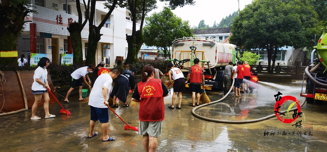 7月1日,县直各单位、各镇积极深入各受灾点开展清淤和重建工作。